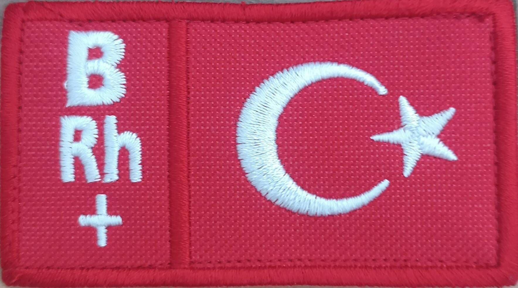 Kırmızı üzeri beyaz yazılı ve türk bayraklı kan grubu patch