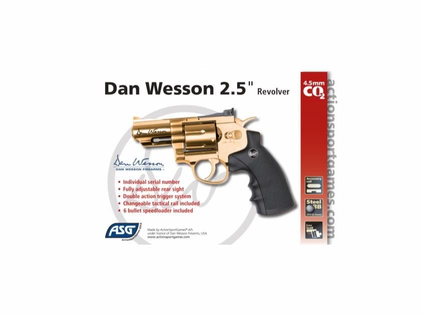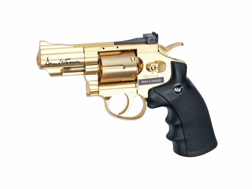 Eye-catching and compact, this discussing piece is a must have for all wanna-be gansta rappers, and people who just like being noticed. This 2.5” Gold airgun revolver licensed by Dan Wesson, offers realistic shooting fun in a handy size. It has authentic markings and a individual serial number stamped into the frame. The revolver features a double action trigger system and adjustable rear sight for extra realism and accuracy. The Dan Wesson revolver is made of metal except for the ergonomic grip constructed in hard ABS plastic. The 12g CO2 cartridge is stored in the grip and is easily accessed by sliding the grip back – easy-load style. Each of the 6 cartridges holds one 4.5mm BB and is placed in the metal cylinder that rotates as each round is fired. The revolver comes with speed-loader, attachable tactical rail and 6 cartridges.